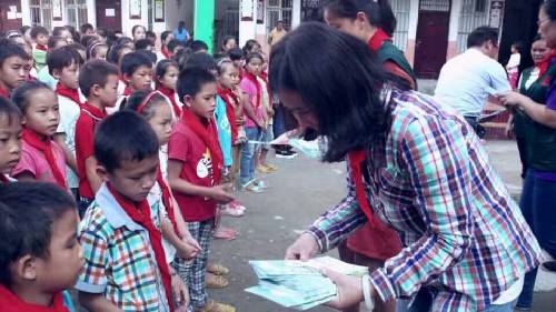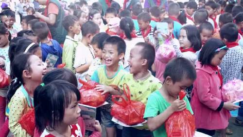 早晨7點鐘,愛心隊伍從南寧地王大廈出發(fā),途中路況極差,塵土飛舞。車隊歷經九個小時到達泮水鄉(xiāng)村冊外小學。愛心團隊的到來,頓時令這個校園學生歡騰熱鬧起來,學生排好整齊的隊伍歡迎著愛心隊伍的到來。學生代表們給到場的每一位愛心人士戴上了感恩紅巾。