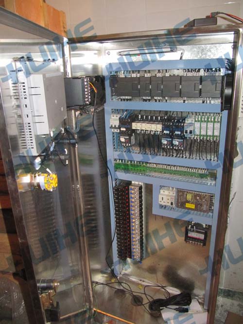 下圖為該全自動CIP清洗系統(tǒng)的控制柜內(nèi)部構(gòu)造及PLC顯示屏的運(yùn)行界面。