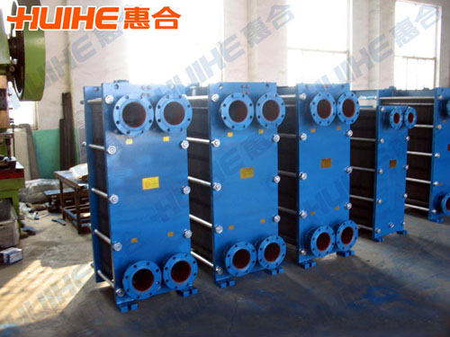 板式換熱器是由固定擋板、板片、移動(dòng)擋板、立柱、上導(dǎo)軌、下導(dǎo)軌及固定螺栓組成。在固定擋板及移動(dòng)擋板之間是一系列被固定的板片。每片板片均有墊圈,所以板片間構(gòu)成相互平行的封閉流道,介質(zhì)在每?jī)蓧K板片之間交替流動(dòng)。
