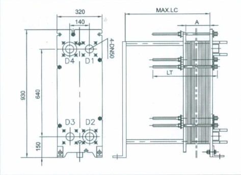 板式換熱器是由固定擋板、板片、移動(dòng)擋板、立柱、上導(dǎo)軌、下導(dǎo)軌及固定螺栓組成。在固定擋板及移動(dòng)擋板之間是一系列被固定的板片。每片板片均有墊圈,所以板片間構(gòu)成相互平行的封閉流道,介質(zhì)在每?jī)蓧K板片之間交替流動(dòng)。