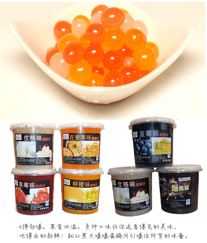 魔力豆(爆爆珠): 外覆海藻膠薄膜,內(nèi)包果汁;經(jīng)低溫殺菌,可常溫保存一年,使用方便。(開啟后須冷藏)。柳橙爆爆蛋以新鮮柳橙為原料經(jīng)過調(diào)配、殺菌、灌裝等工序生產(chǎn)的果汁飲料產(chǎn)品。